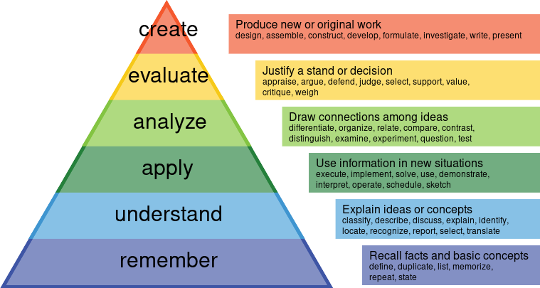 If you start with the top of the pyramid (Creation), that is fine, but if you don’t work your way down the layers of the pyramid, all the way to Remembering, then you won’t be learning anything.