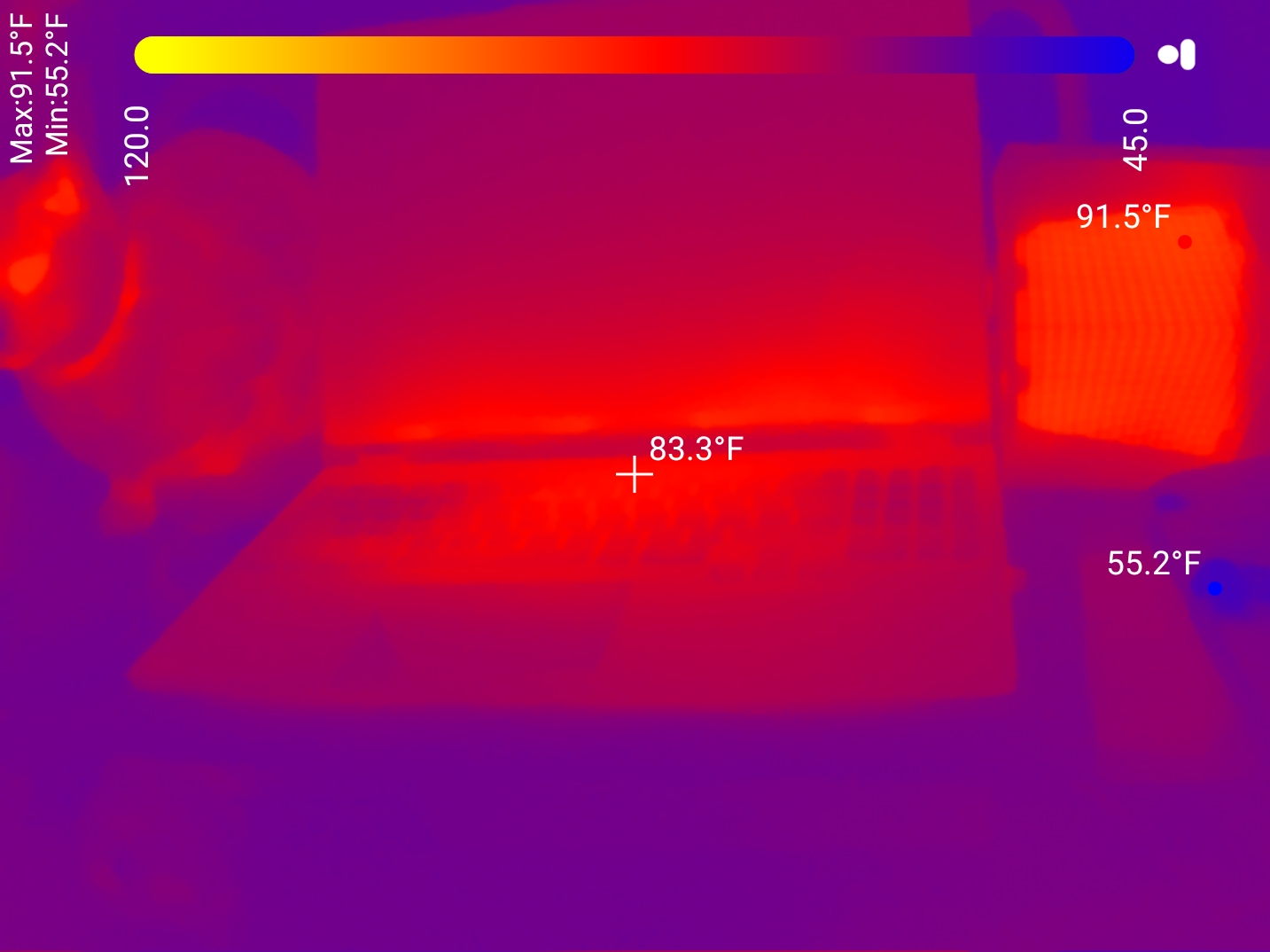 At normal fan speeds, it ends up at the same ~83F as the laptop, as expected.