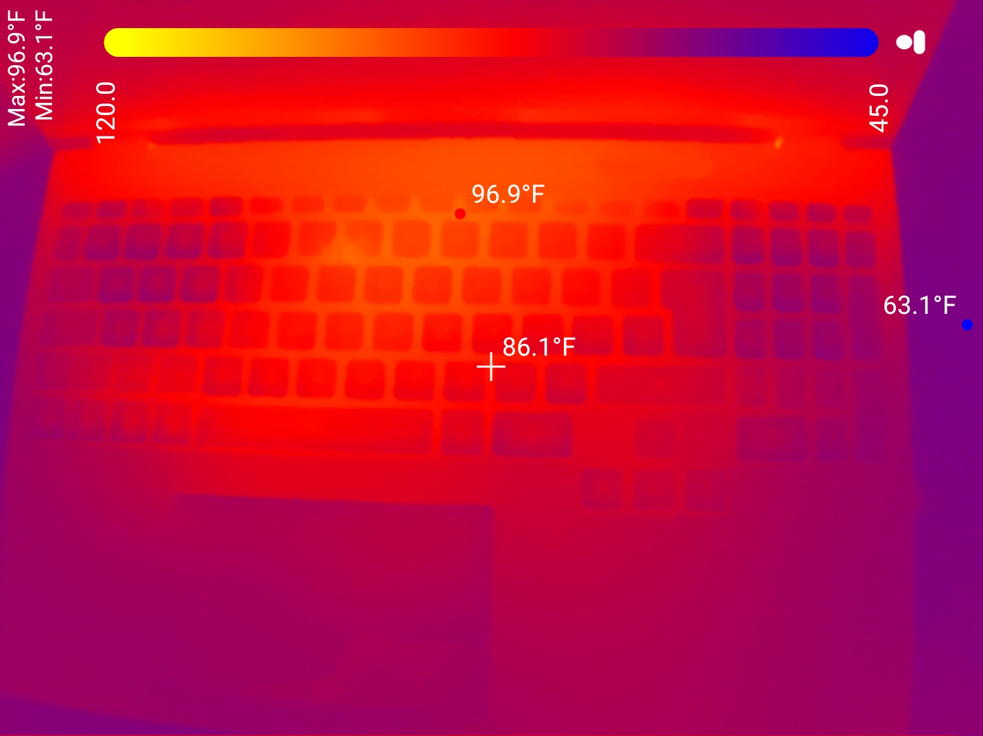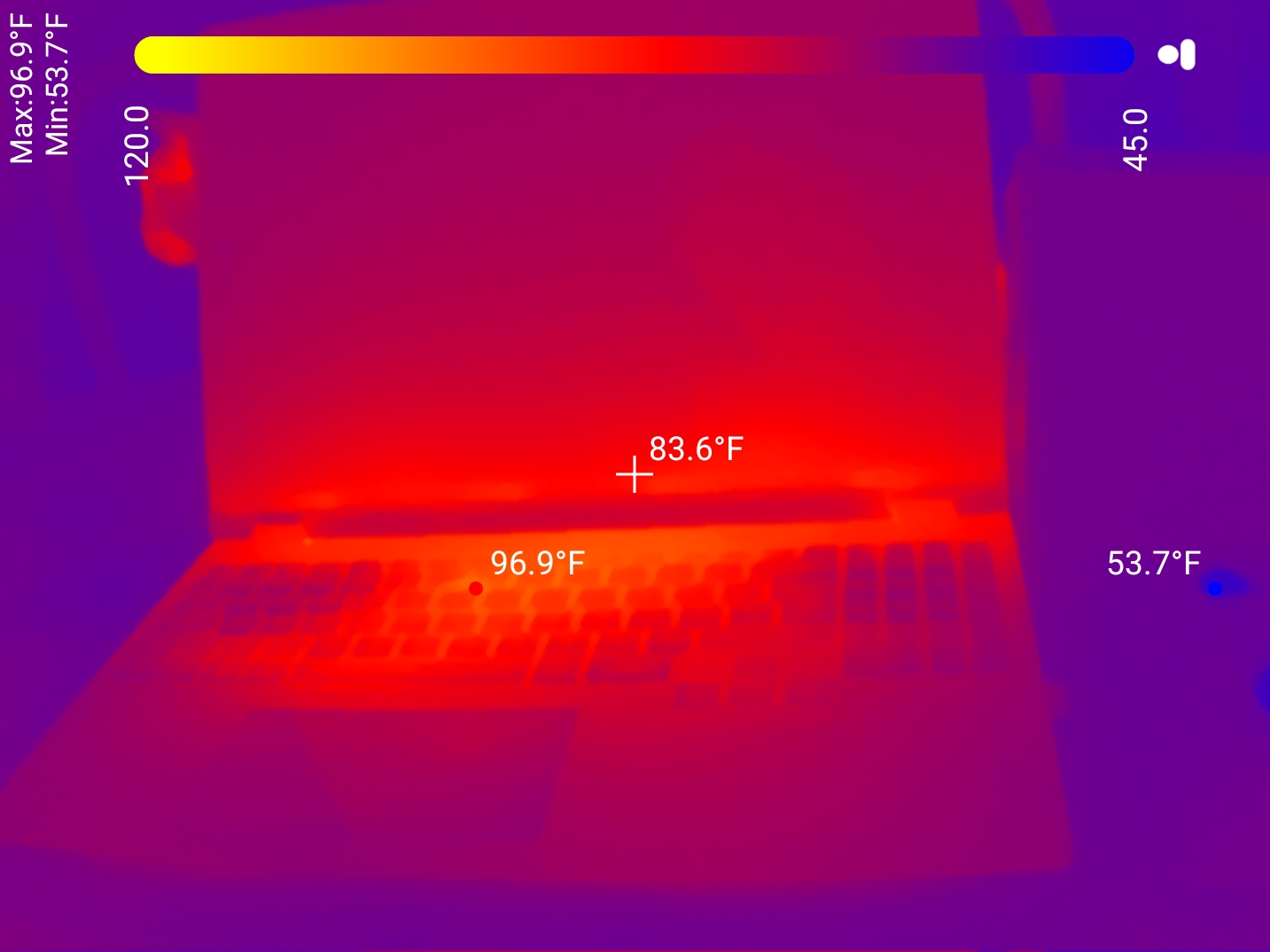This is the laptop under full load with the lid closed for a few minutes, then open to show the temps: