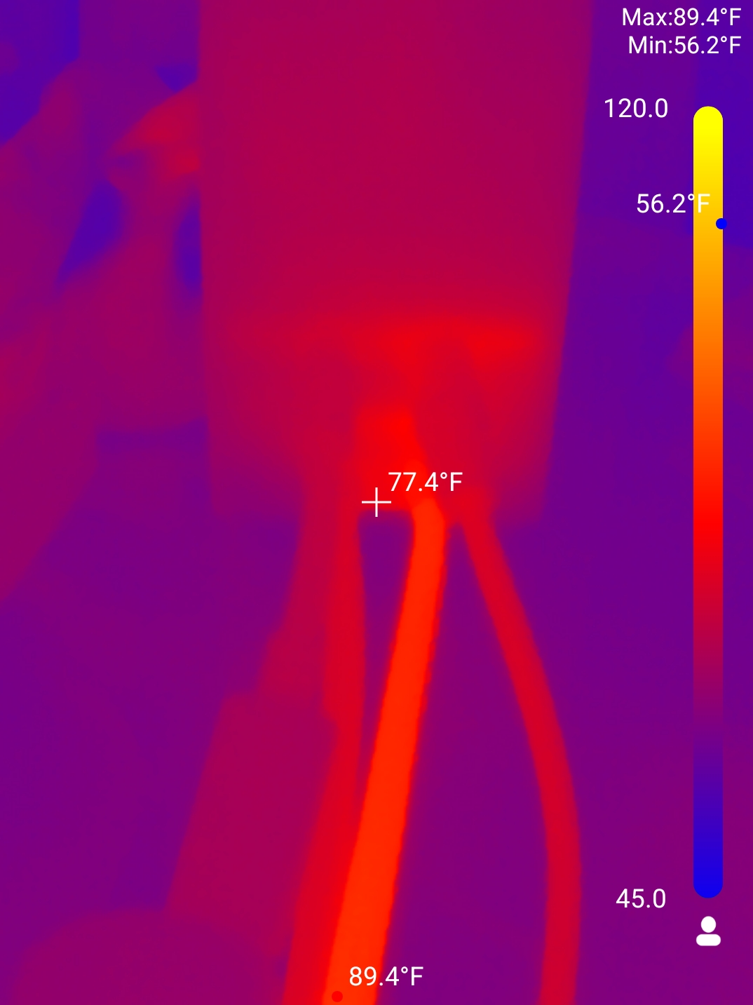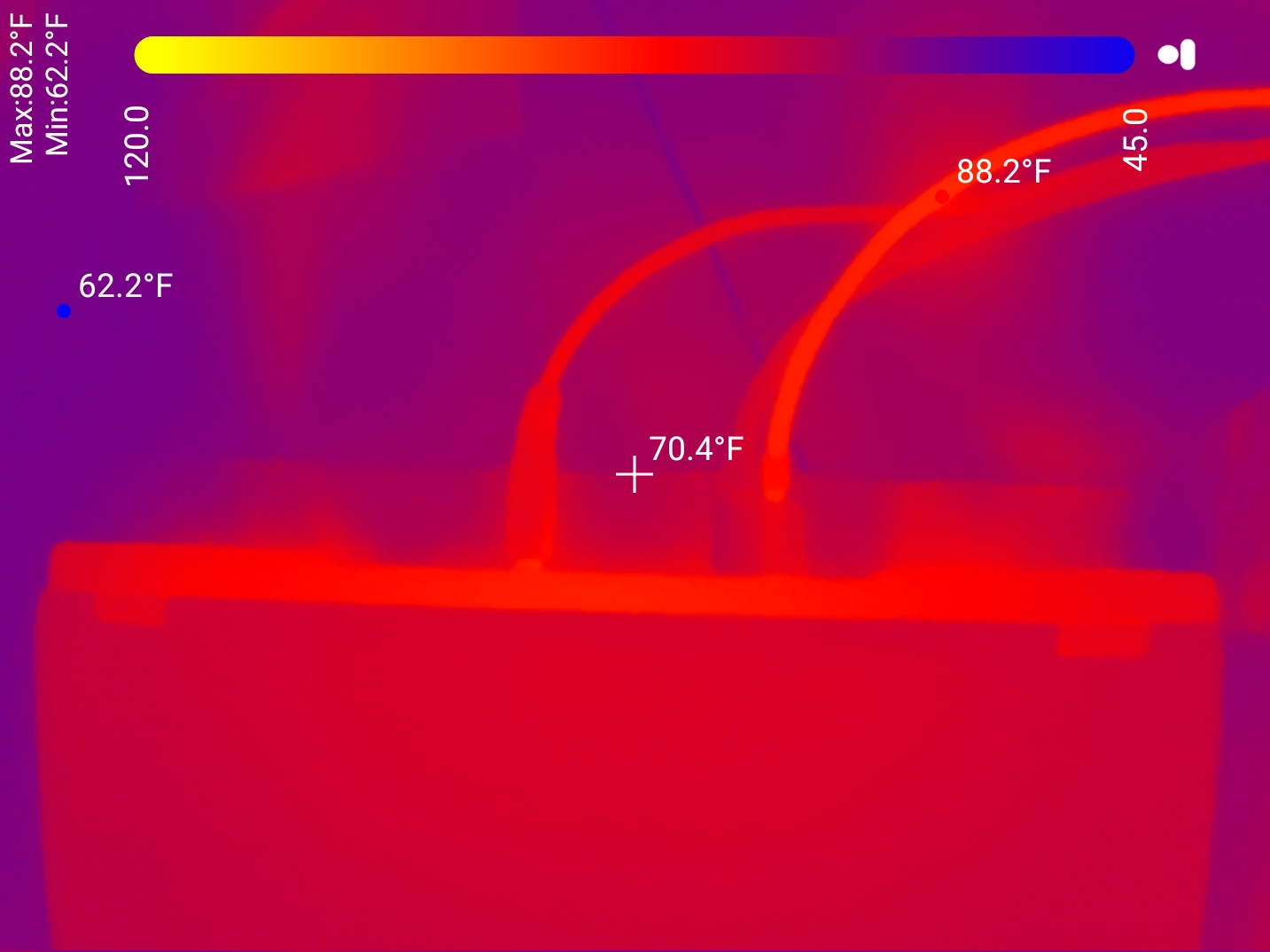 (notice the power cable is hot, but the water pipes are cool because they are NOT running)